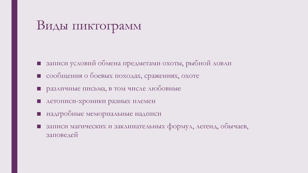Виды пиктограмм■ записи условий обмена предметами охоты, рыбной ловли