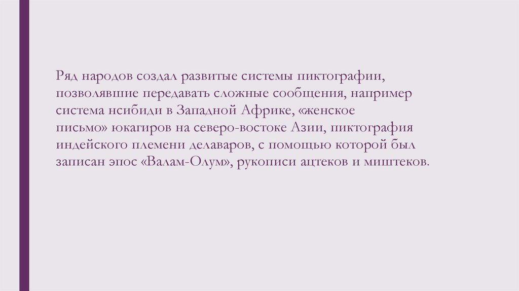 Ряд народов создал развитые системы пиктографии,позволявшие передавать сложные сообщения, например