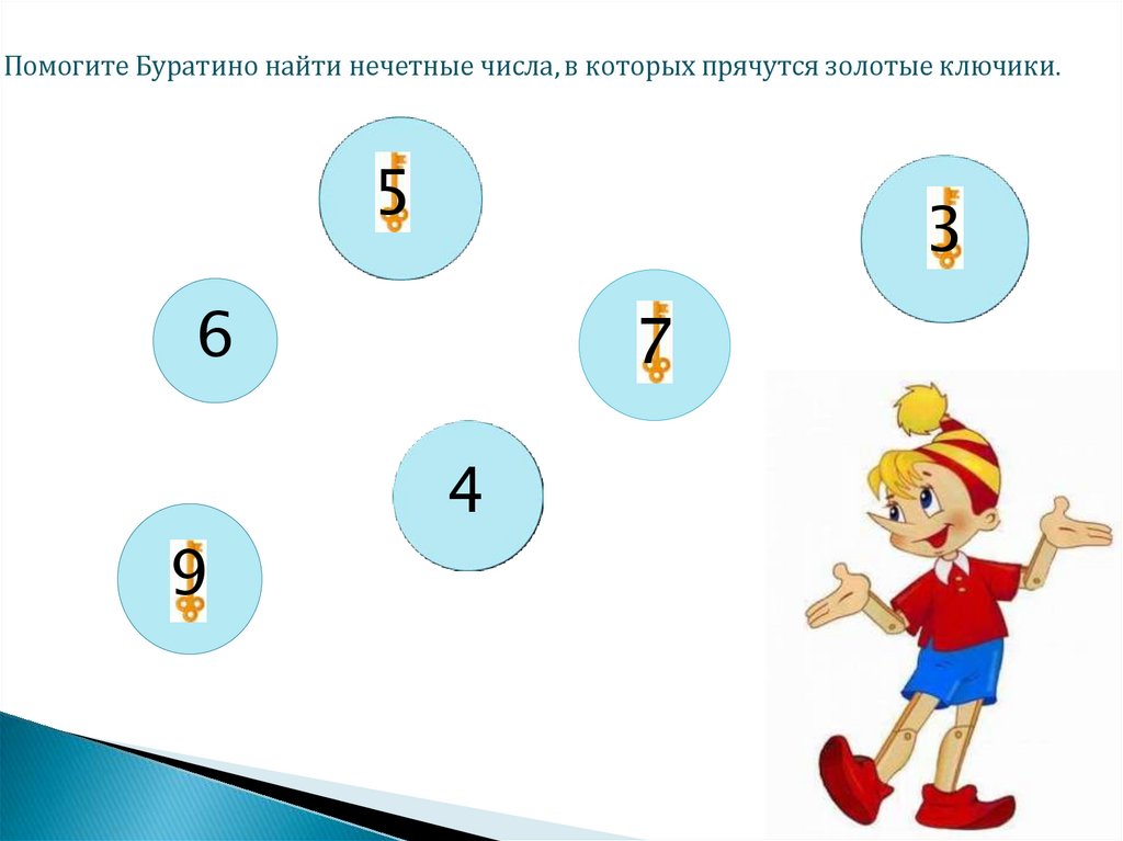 Помогите Буратино найти нечетные числа, в которых прячутся золотые ключики.
