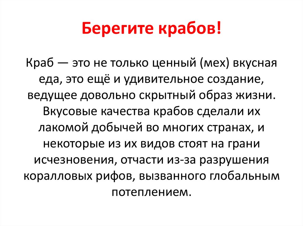 Берегите крабов!Краб — это не только ценный (мех) вкусная