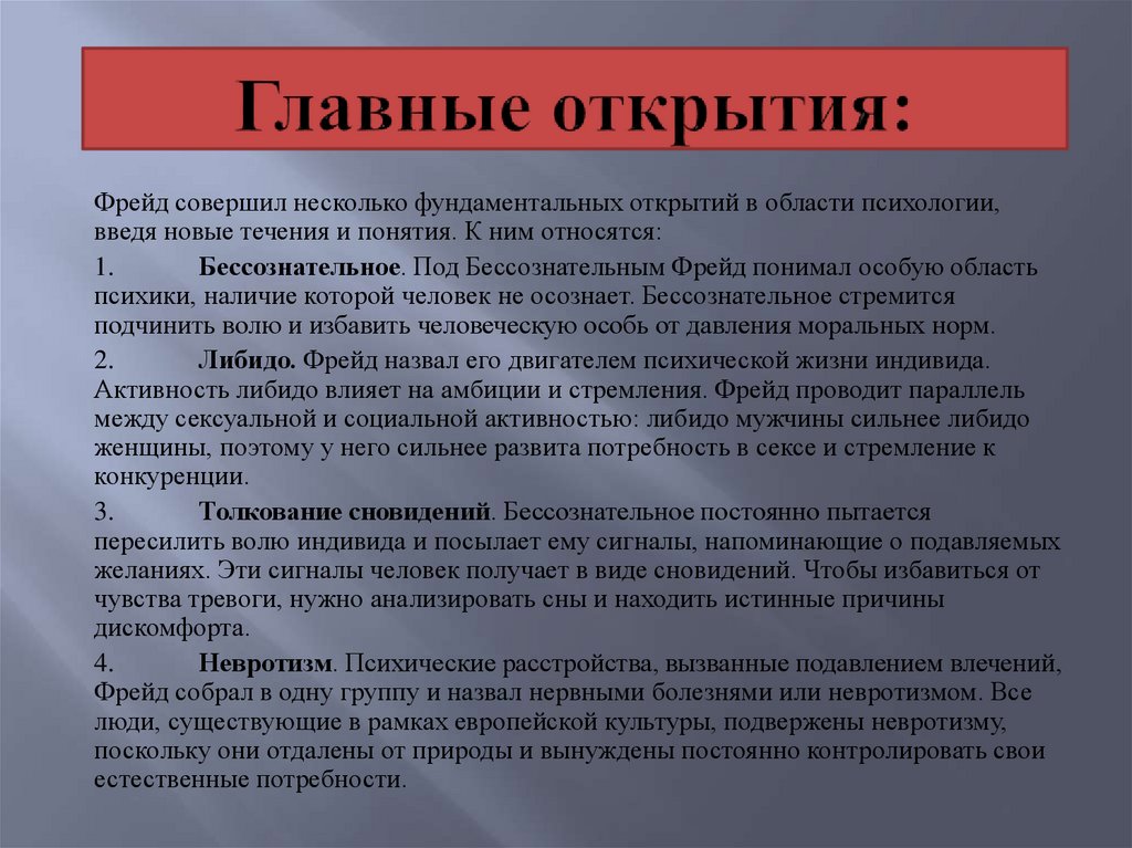 Фрейд совершил несколько фундаментальных открытий в области психологии,введя новые течения и понятия. К ним относятся: