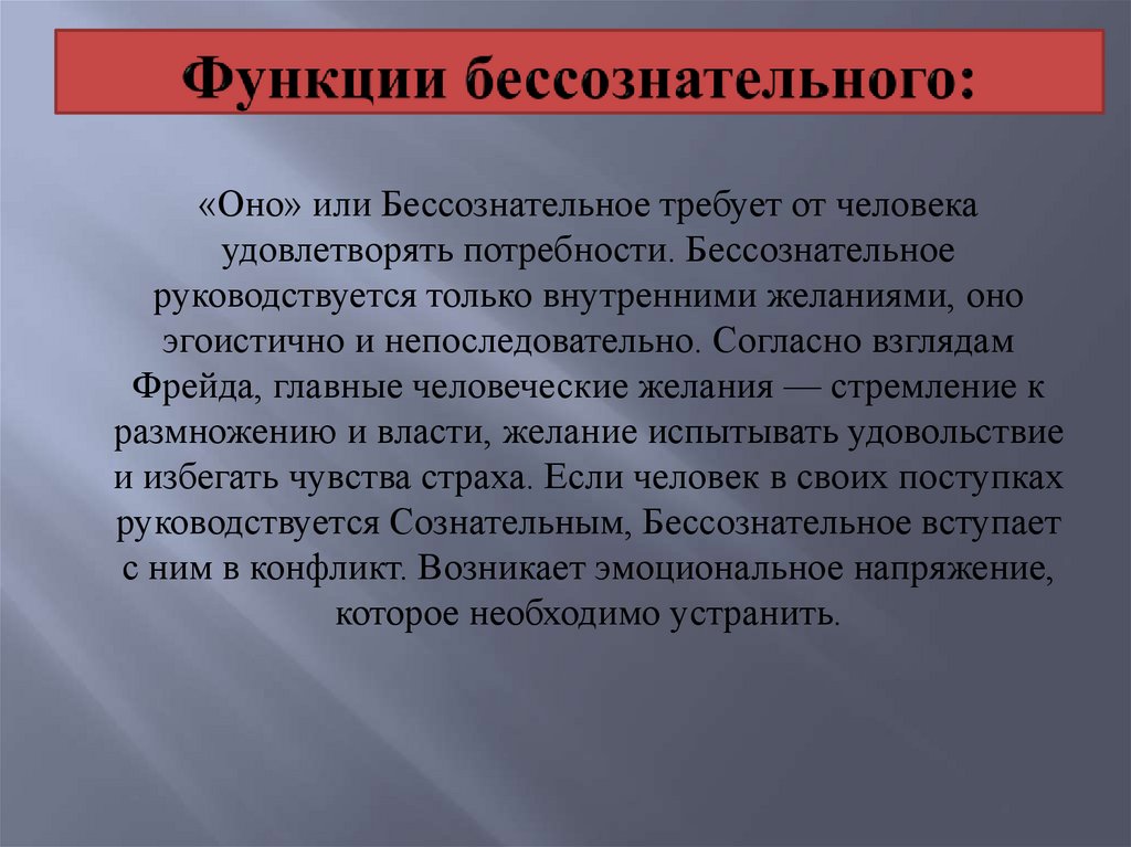 «Оно» или Бессознательное требует от человекаудовлетворять потребности. Бессознательное
