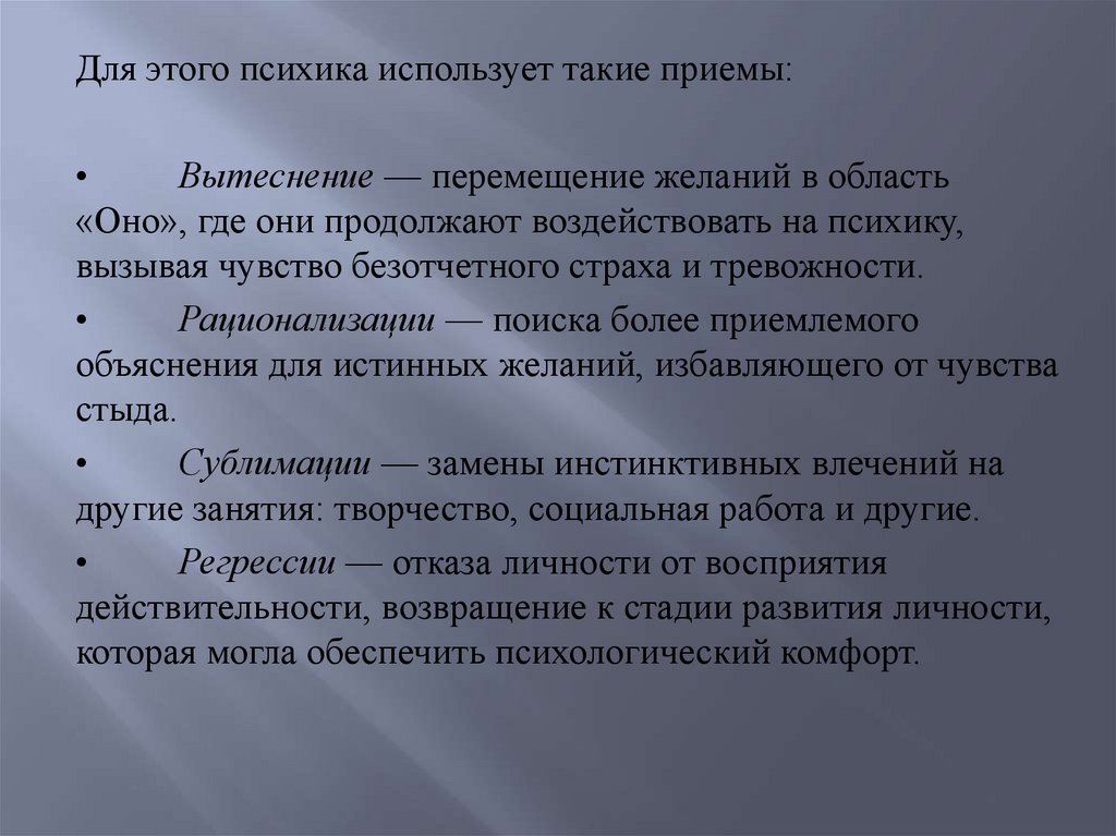 Для этого психика использует такие приемы:Вытеснение — перемещение желаний в область