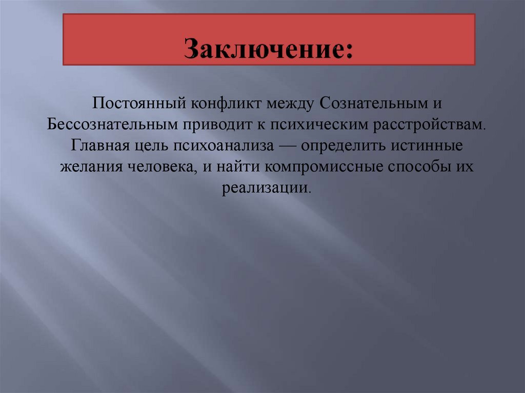 Постоянный конфликт между Сознательным иБессознательным приводит к психическим расстройствам.