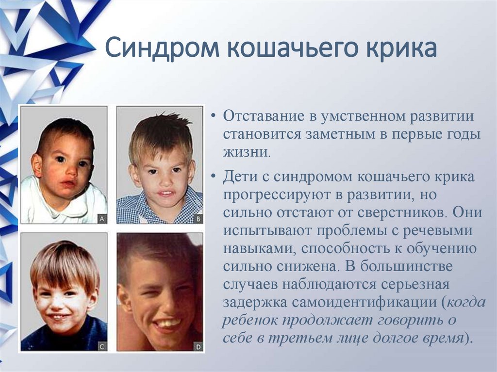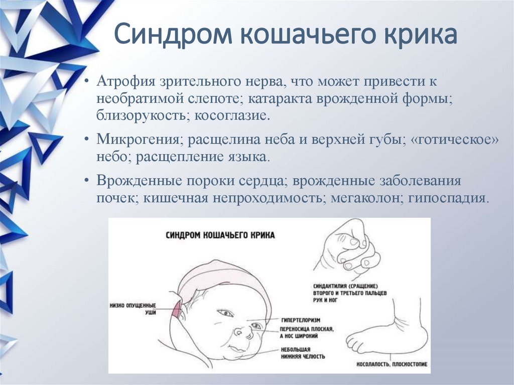 Синдром кошачьего крика• Атрофия зрительного нерва, что может привести к