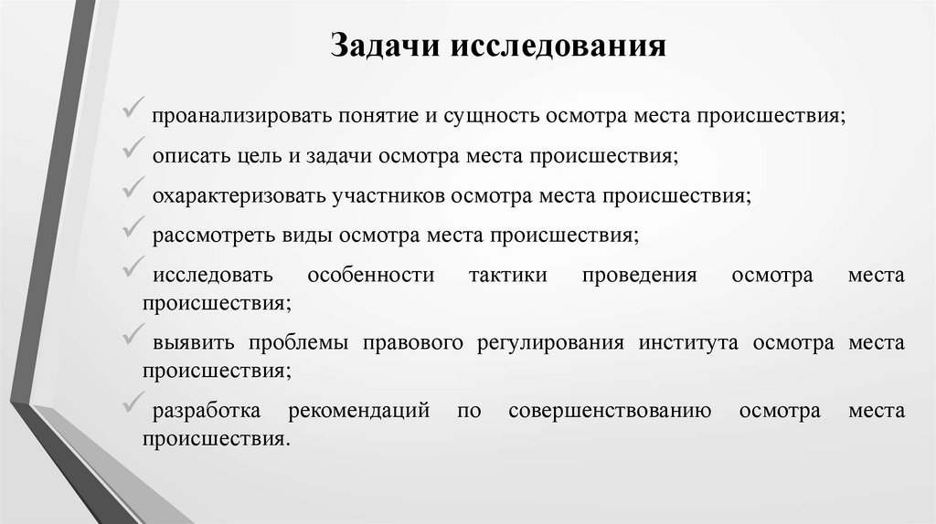 Задачи исследованияпроанализировать понятие и сущность осмотра места происшествия;