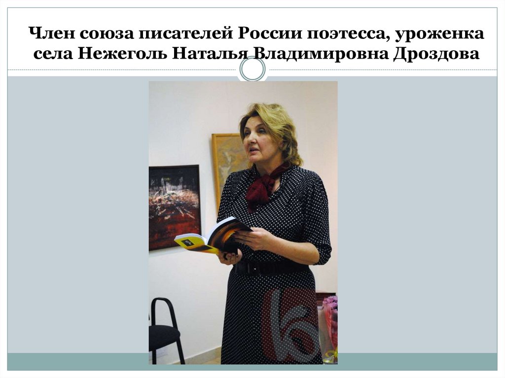 Член союза писателей России поэтесса, уроженкасела Нежеголь Наталья Владимировна Дроздова