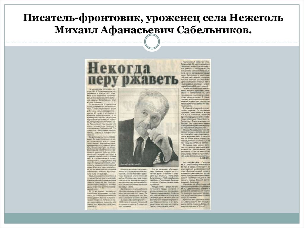 Писатель-фронтовик, уроженец села НежегольМихаил Афанасьевич Сабельников.