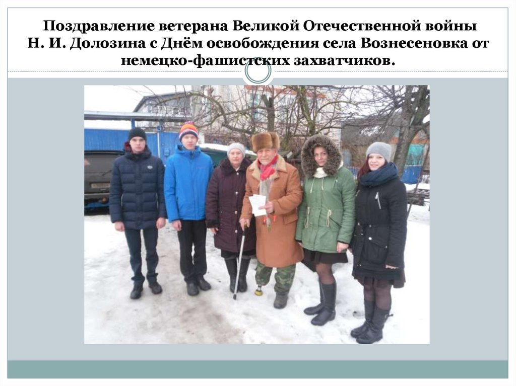 Поздравление ветерана Великой Отечественной войныН. И. Долозина с Днём освобождения села Вознесеновка от