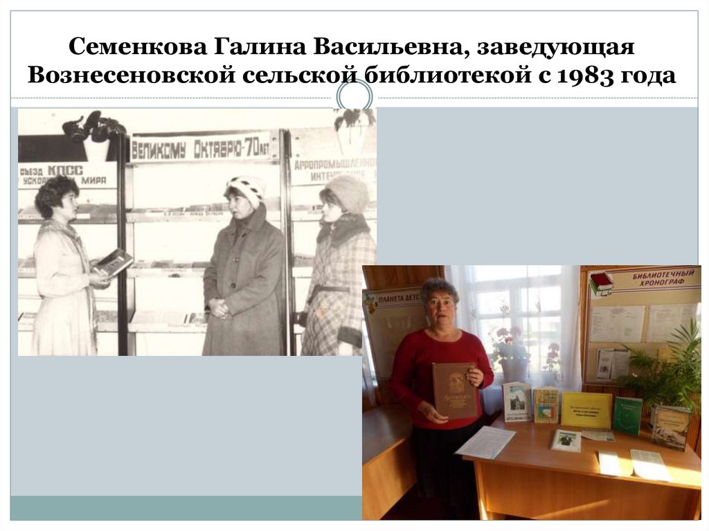Семенкова Галина Васильевна, заведующаяВознесеновской сельской библиотекой с 1983 года