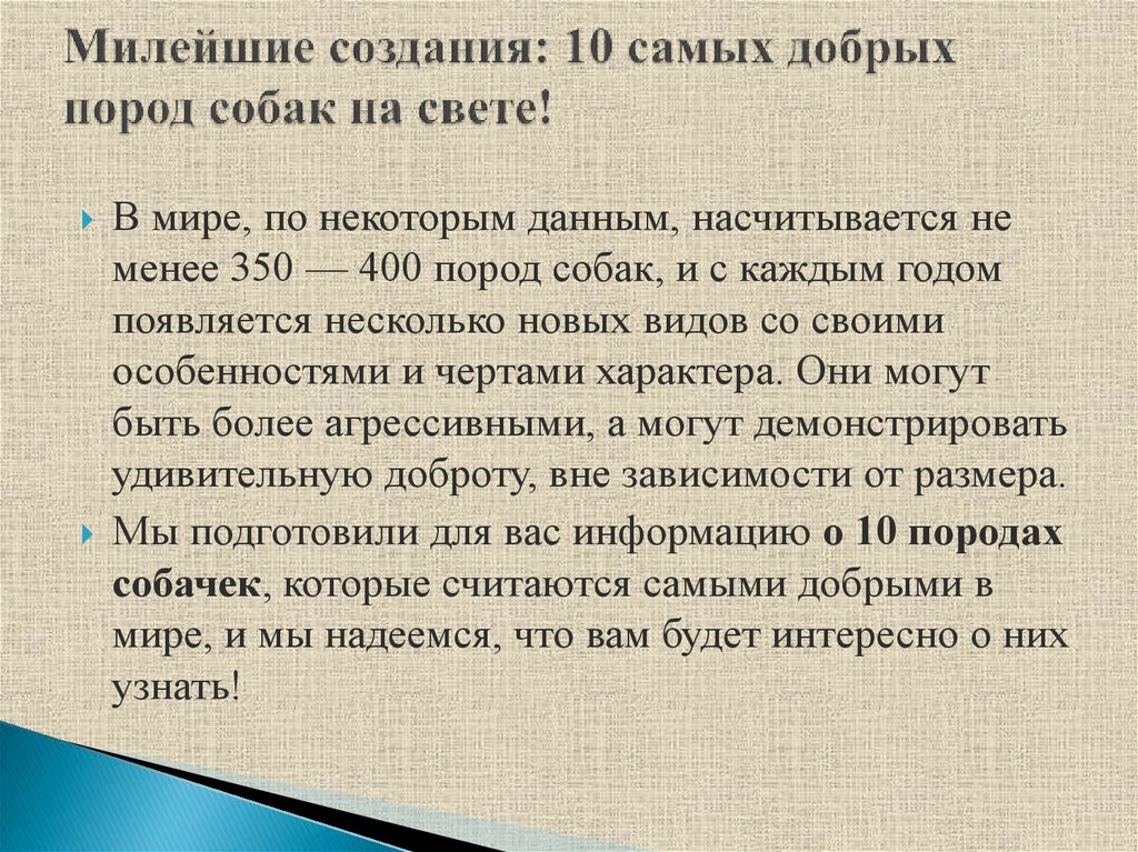 В мире, по некоторым данным, насчитывается неменее 350 — 400 пород собак, и с каждым годом