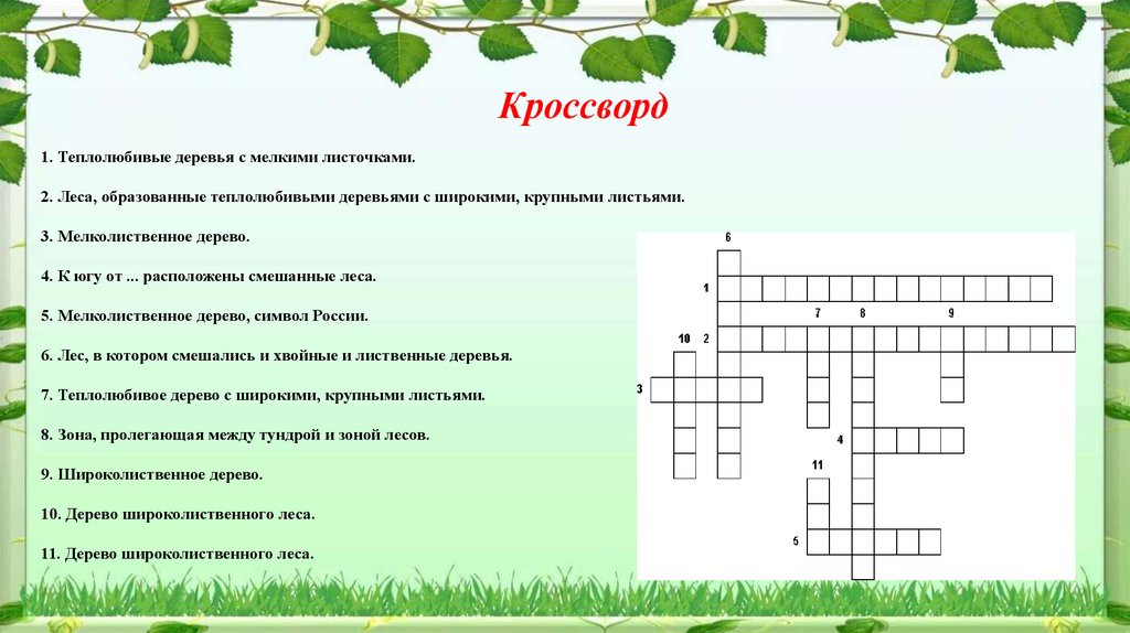 Кроссворд1. Теплолюбивые деревья с мелкими листочками.