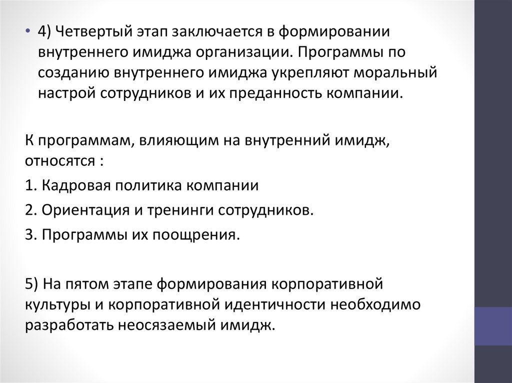 • 4) Четвертый этап заключается в формированиивнутреннего имиджа организации. Программы по