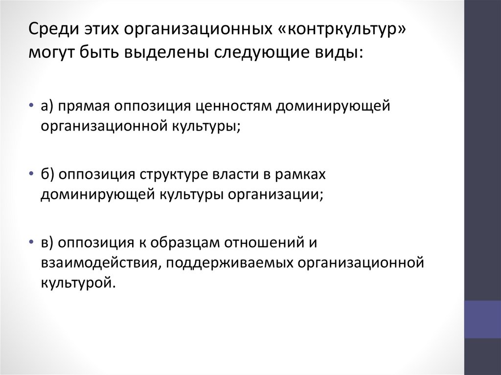 Среди этих организационных «контркультур»могут быть выделены следующие виды:
