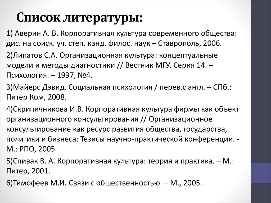 Список литературы:1) Аверин А. В. Корпоративная культура современного общества: