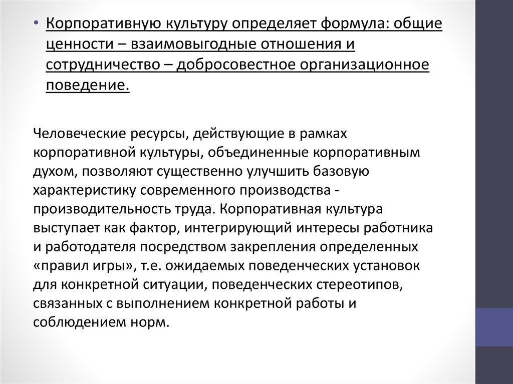 • Корпоративную культуру определяет формула: общиеценности – взаимовыгодные отношения и
