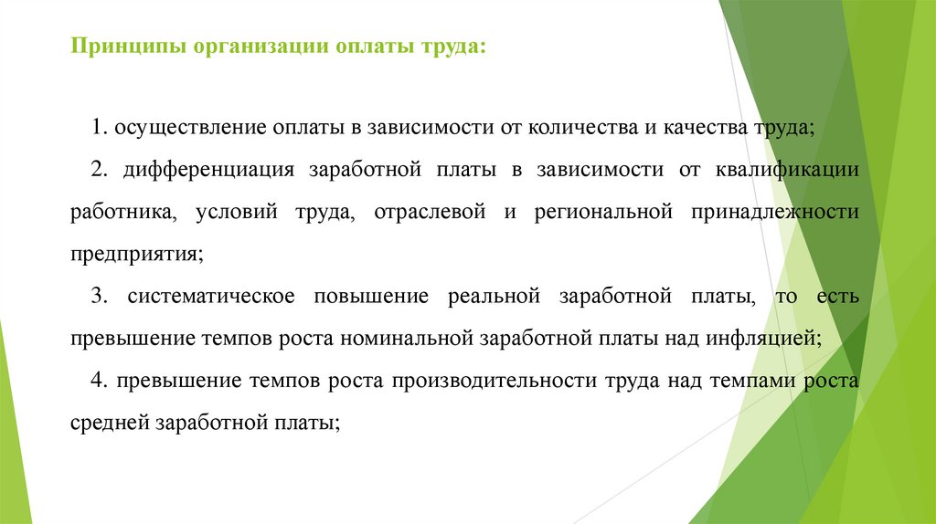 Принципы организации оплаты труда:1. осуществление оплаты в зависимости от количества и качества труда;