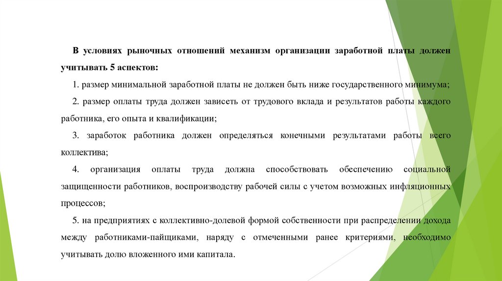 В условиях рыночных отношений механизм организации заработной платы долженучитывать 5 аспектов: