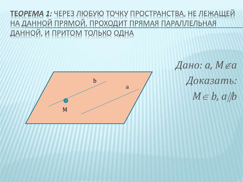 ТЕОРЕМА 1: ЧЕРЕЗ ЛЮБУЮ ТОЧКУ ПРОСТРАНСТВА, НЕ ЛЕЖАЩЕЙНА ДАННОЙ ПРЯМОЙ, ПРОХОДИТ ПРЯМАЯ ПАРАЛЛЕЛЬНАЯ