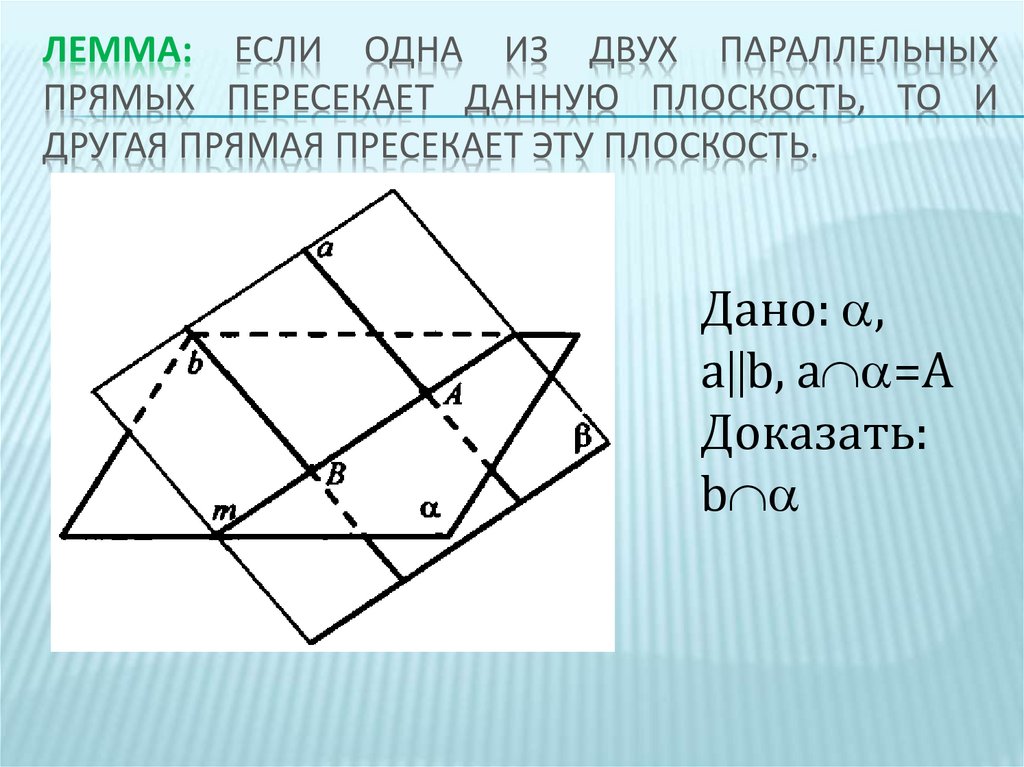 ЛЕММА: ЕСЛИ ОДНА ИЗ ДВУХ ПАРАЛЛЕЛЬНЫХПРЯМЫХ ПЕРЕСЕКАЕТ ДАННУЮ ПЛОСКОСТЬ, ТО И