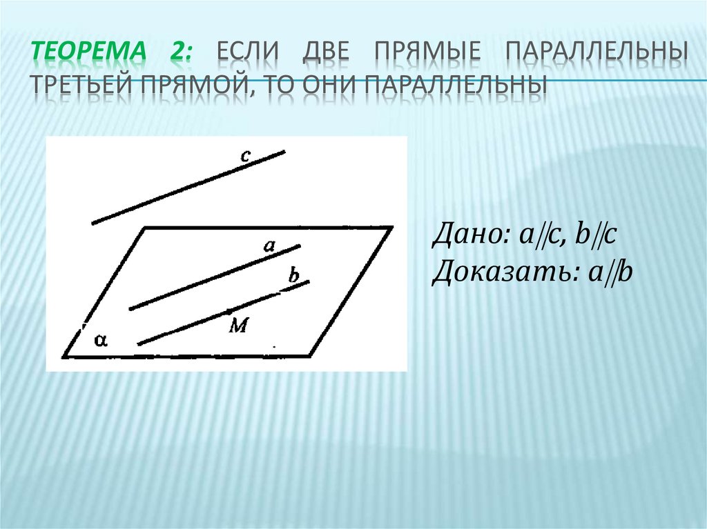 ТЕОРЕМА 2: ЕСЛИ ДВЕ ПРЯМЫЕ ПАРАЛЛЕЛЬНЫТРЕТЬЕЙ ПРЯМОЙ, ТО ОНИ ПАРАЛЛЕЛЬНЫ