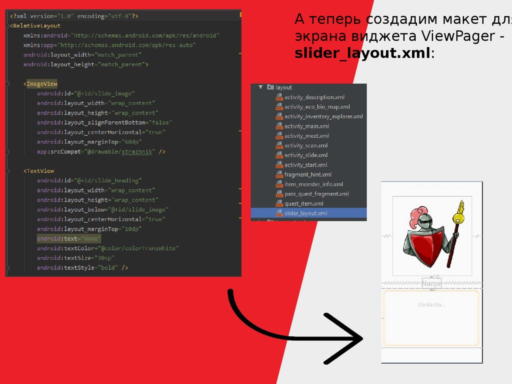 А теперь создадим макет дляэкрана виджета ViewPager slider_layout.xml: