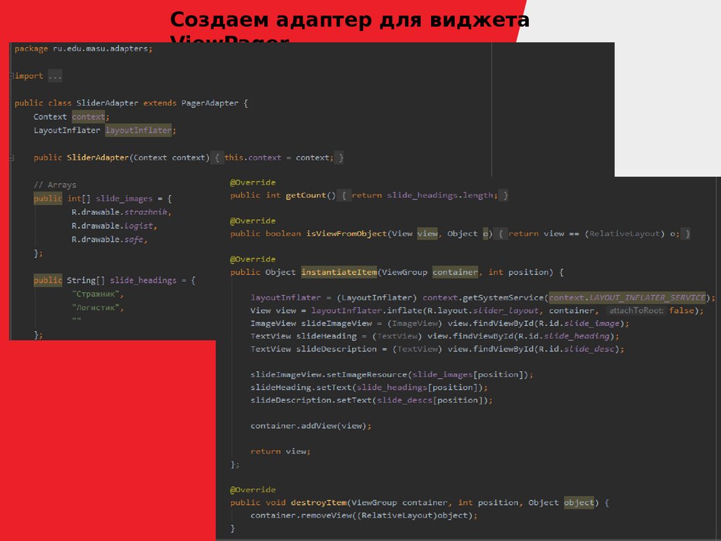 Теперь инициализируем ViewPager готовым адаптеромSlideAdapter в методе onCreate() класса