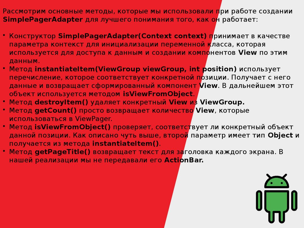 Рассмотрим основные методы, которые мы использовали при работе созданииSimplePagerAdapter для лучшего понимания того, как он работает: