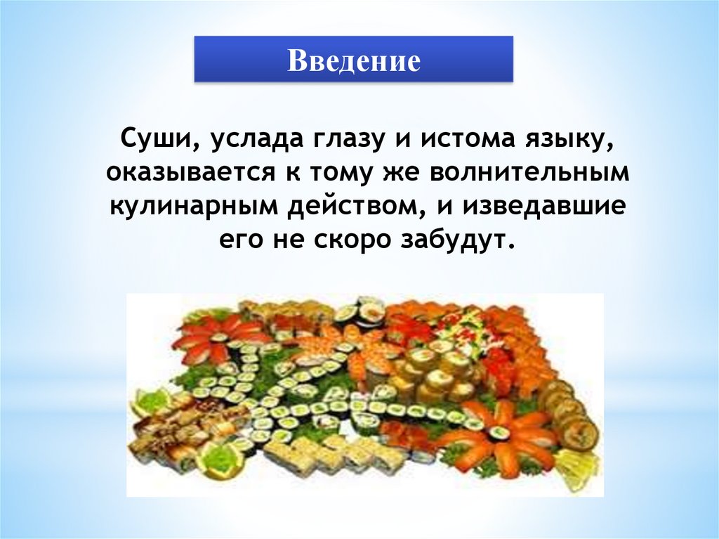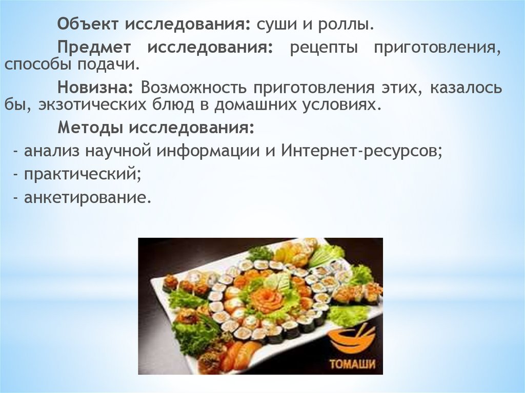 Объект исследования: суши и роллы.Предмет исследования: рецепты приготовления,
