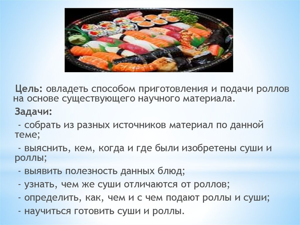 Цель: овладеть способом приготовления и подачи ролловна основе существующего научного материала.
