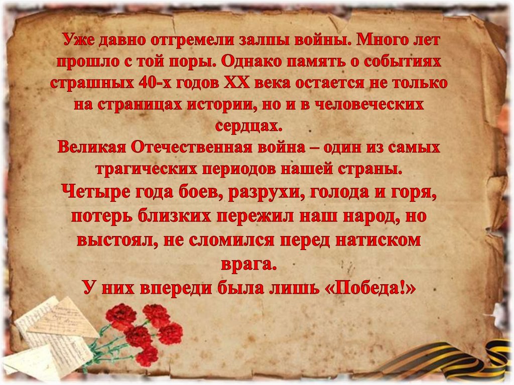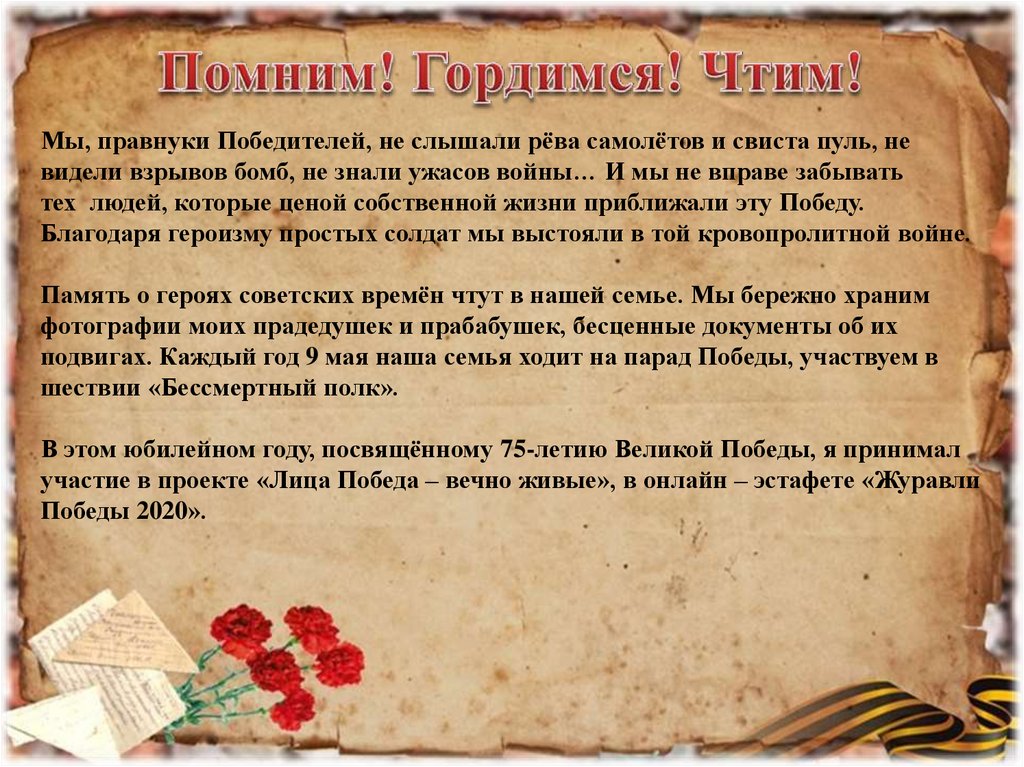 Мы, правнуки Победителей, не слышали рёва самолётов и свиста пуль, невидели взрывов бомб, не знали ужасов войны… И мы не вправе забывать