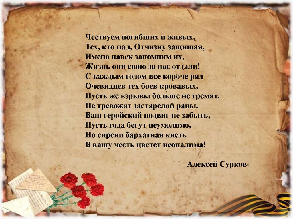 Чествуем погибших и живых,Тех, кто пал, Отчизну защищая,