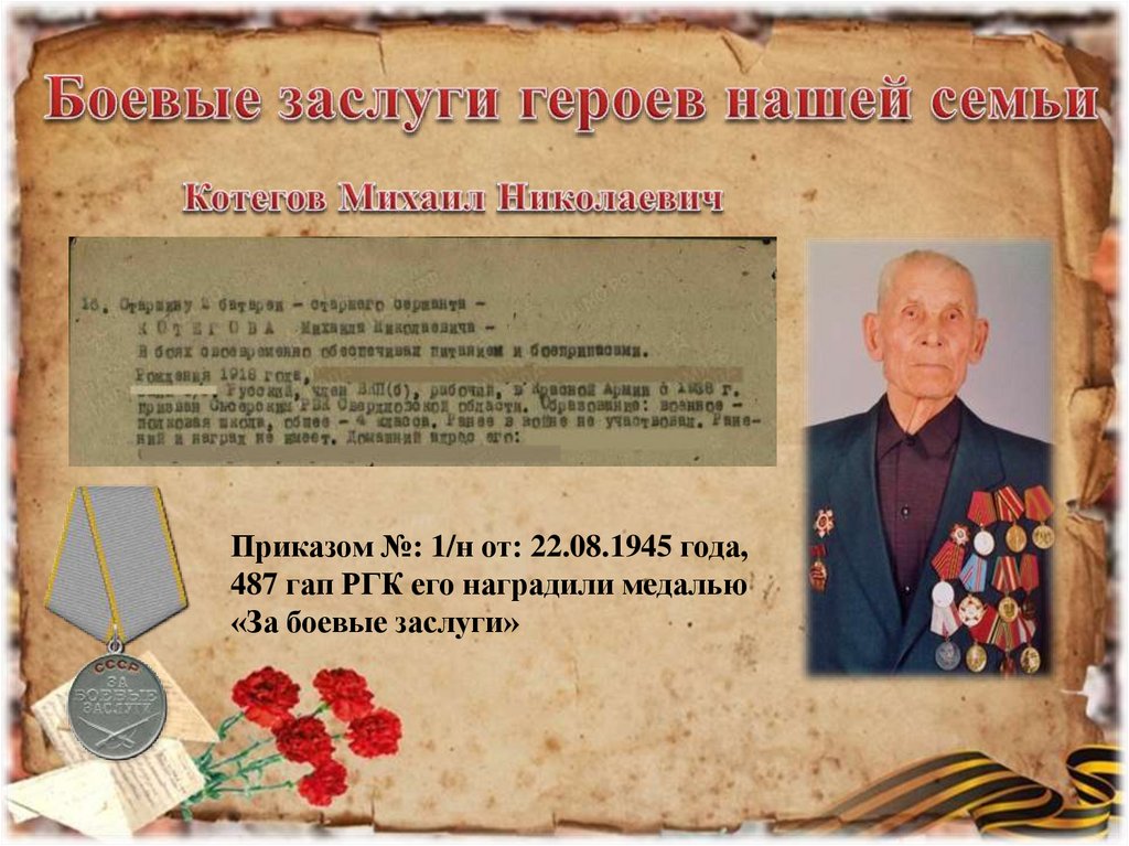 Приказом №: 1/н от: 22.08.1945 года,487 гап РГК его наградили медалью