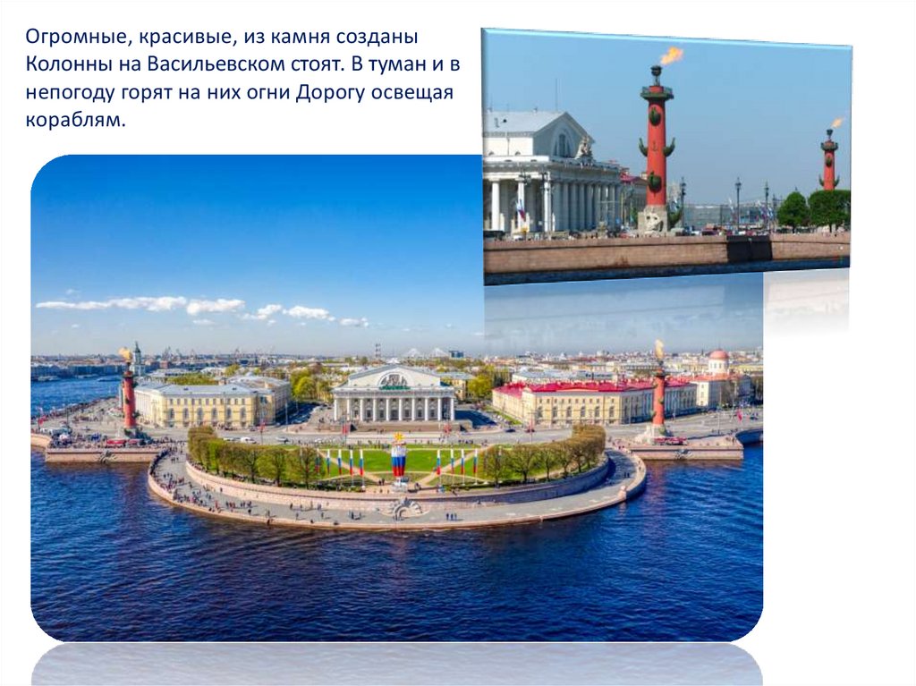 Огромные, красивые, из камня созданыКолонны на Васильевском стоят. В туман и в