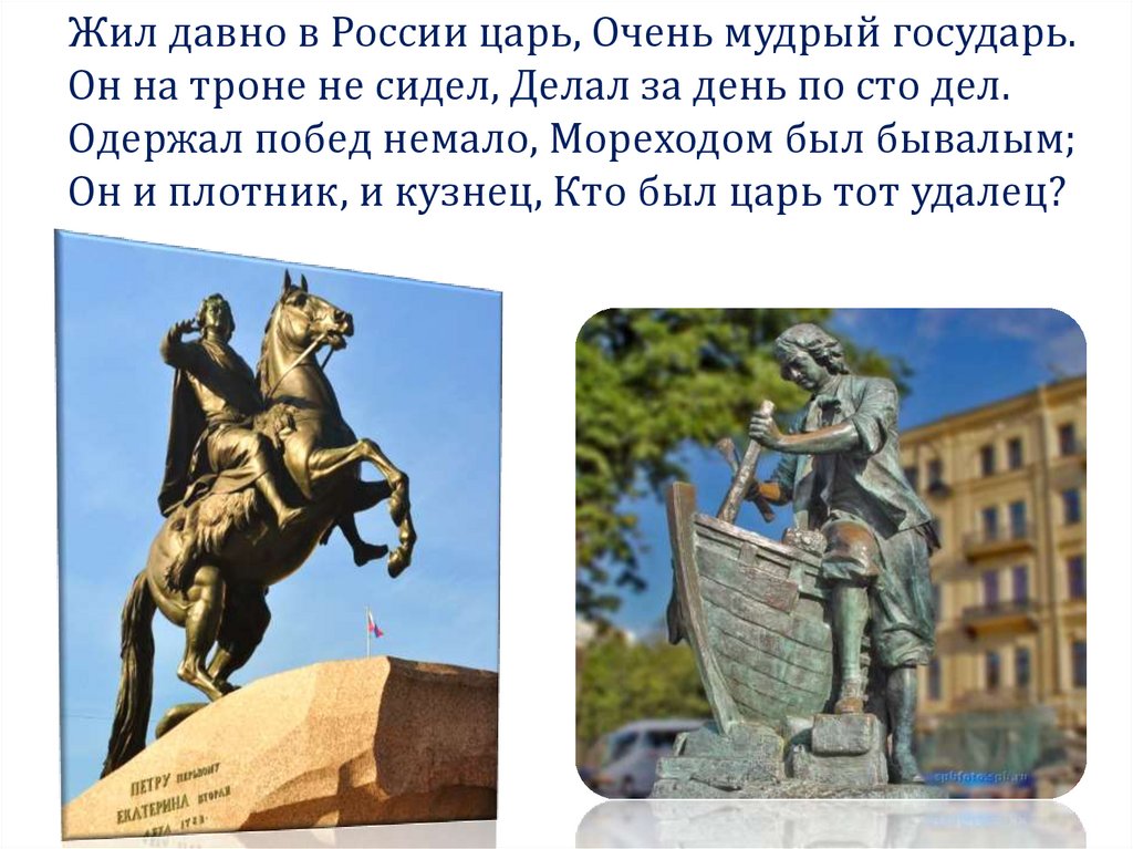 Жил давно в России царь, Очень мудрый государь.Он на троне не сидел, Делал за день по сто дел.
