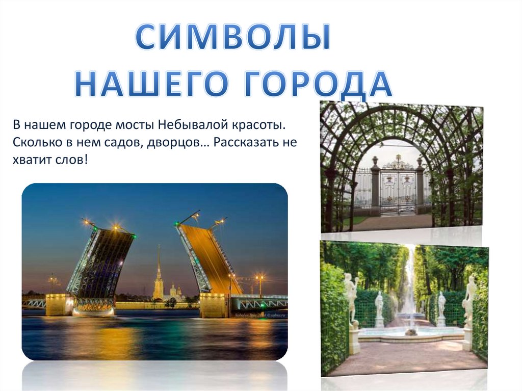 В нашем городе мосты Небывалой красоты.Сколько в нем садов, дворцов… Рассказать не