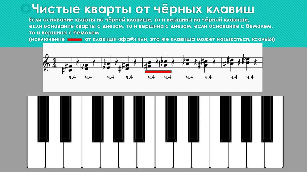 Чистые кварты от чёрных клавишЕсли основание кварты на чёрной клавише, то и вершина на чёрной клавише,
