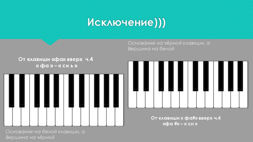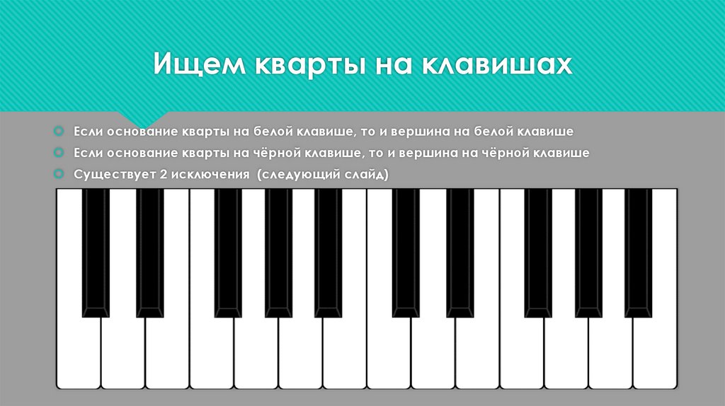 Ищем кварты на клавишахЕсли основание кварты на белой клавише, то и вершина на белой клавише