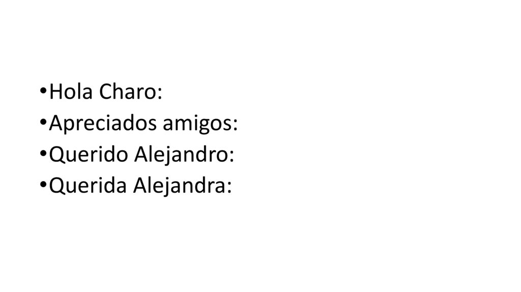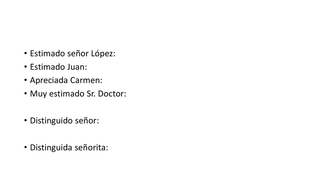 Para las cartas formales comerciales más habituales, basta con iniciar el encabezamiento con:• Distinguido o distinguida (Seguido del nombre):