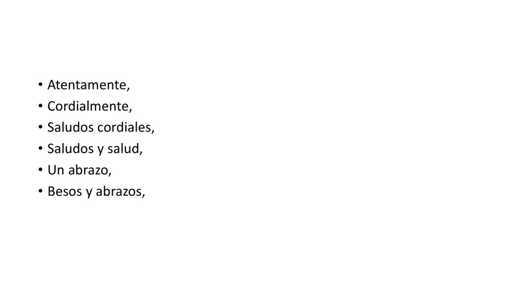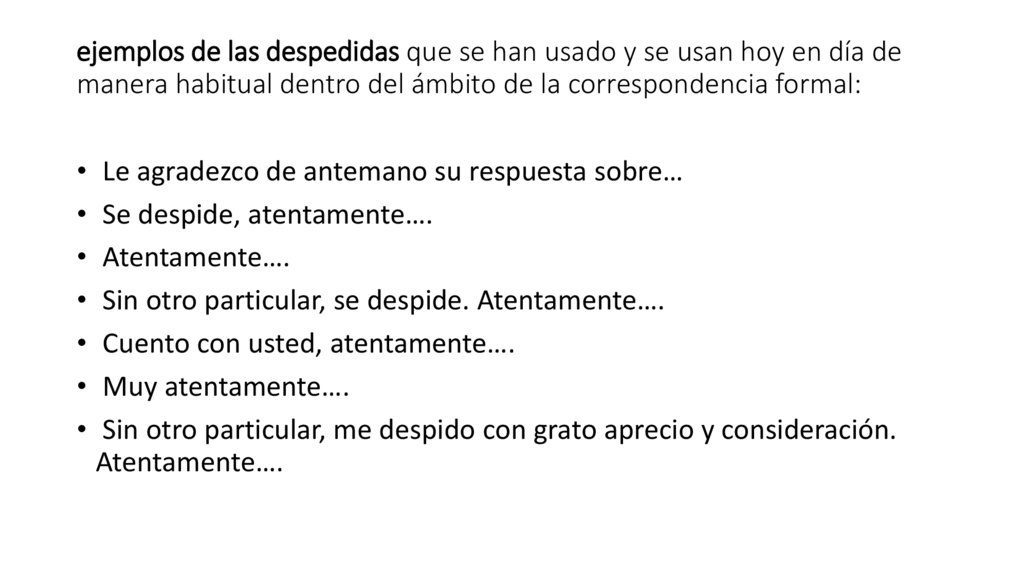 ejemplos de las despedidas que se han usado y se usan hoy en día demanera habitual dentro del ámbito de la correspondencia formal: