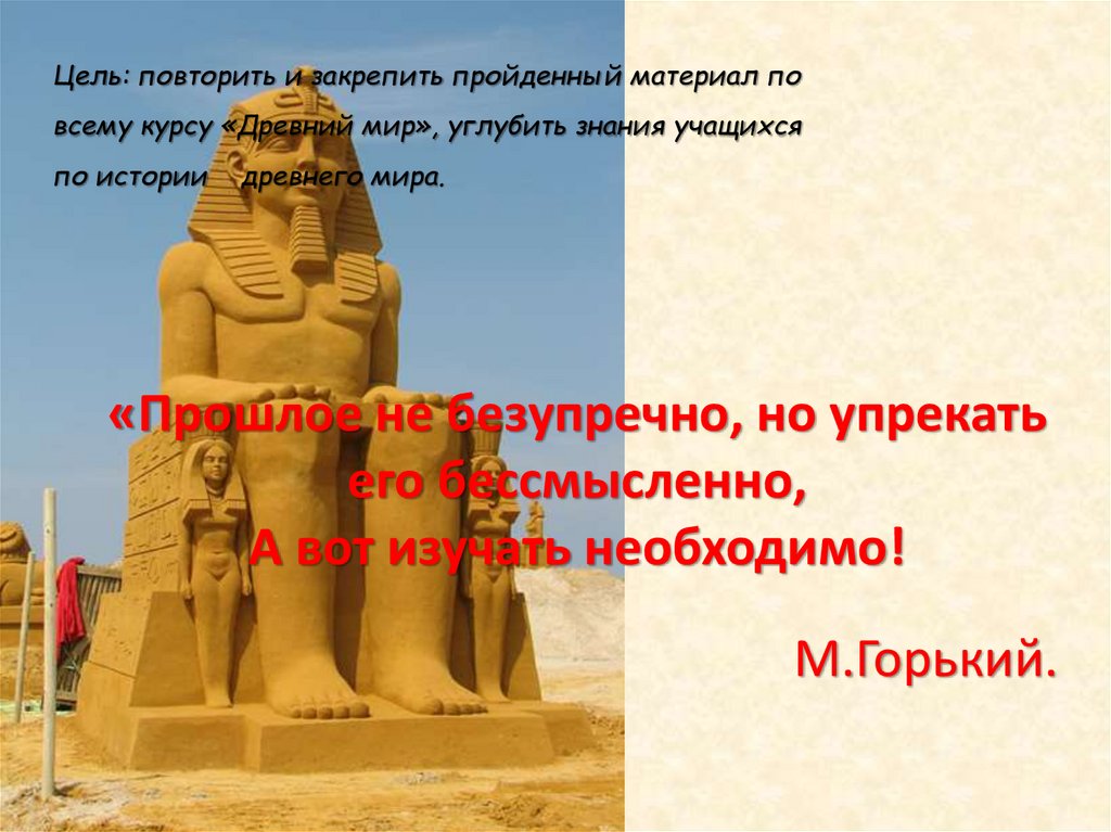 Цель: повторить и закрепить пройденный материал повсему курсу «Древний мир», углубить знания учащихся