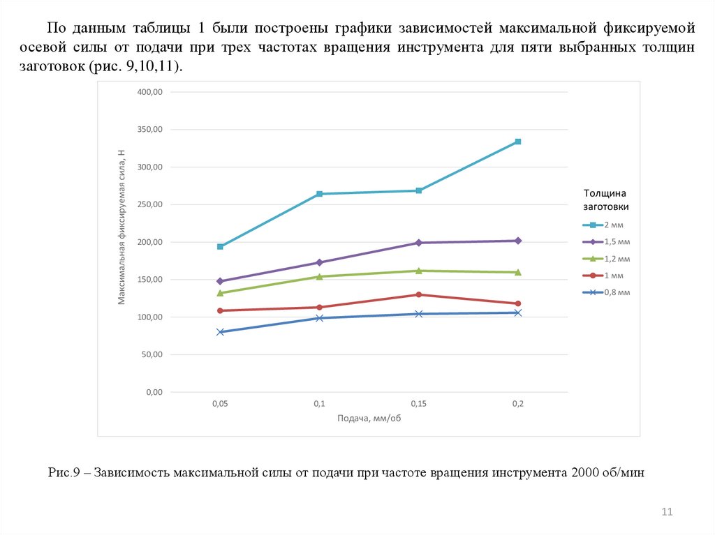 Рис.9 – Зависимость максимальной силы от подачи при частоте вращения инструмента 2000 об/мин