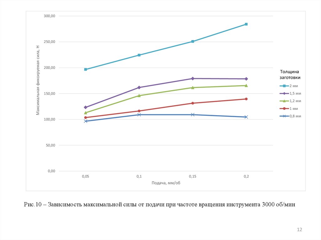 Рис.10 – Зависимость максимальной силы от подачи при частоте вращения инструмента 3000 об/мин