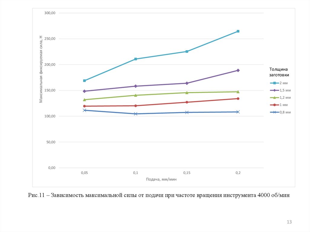 Рис.11 – Зависимость максимальной силы от подачи при частоте вращения инструмента 4000 об/мин