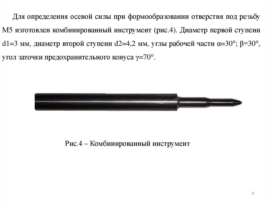 Для определения осевой силы при формообразовании отверстия под резьбуМ5 изготовлен комбинированный инструмент (рис.4). Диаметр первой ступени