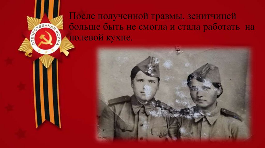 После полученной травмы, зенитчицейбольше быть не смогла и стала работать на