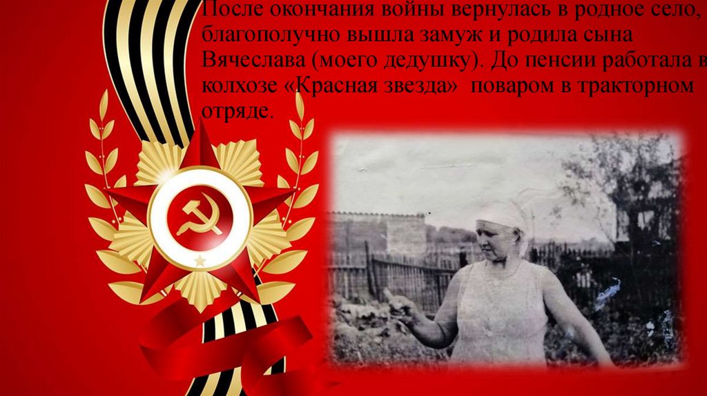 После окончания войны вернулась в родное село,благополучно вышла замуж и родила сына