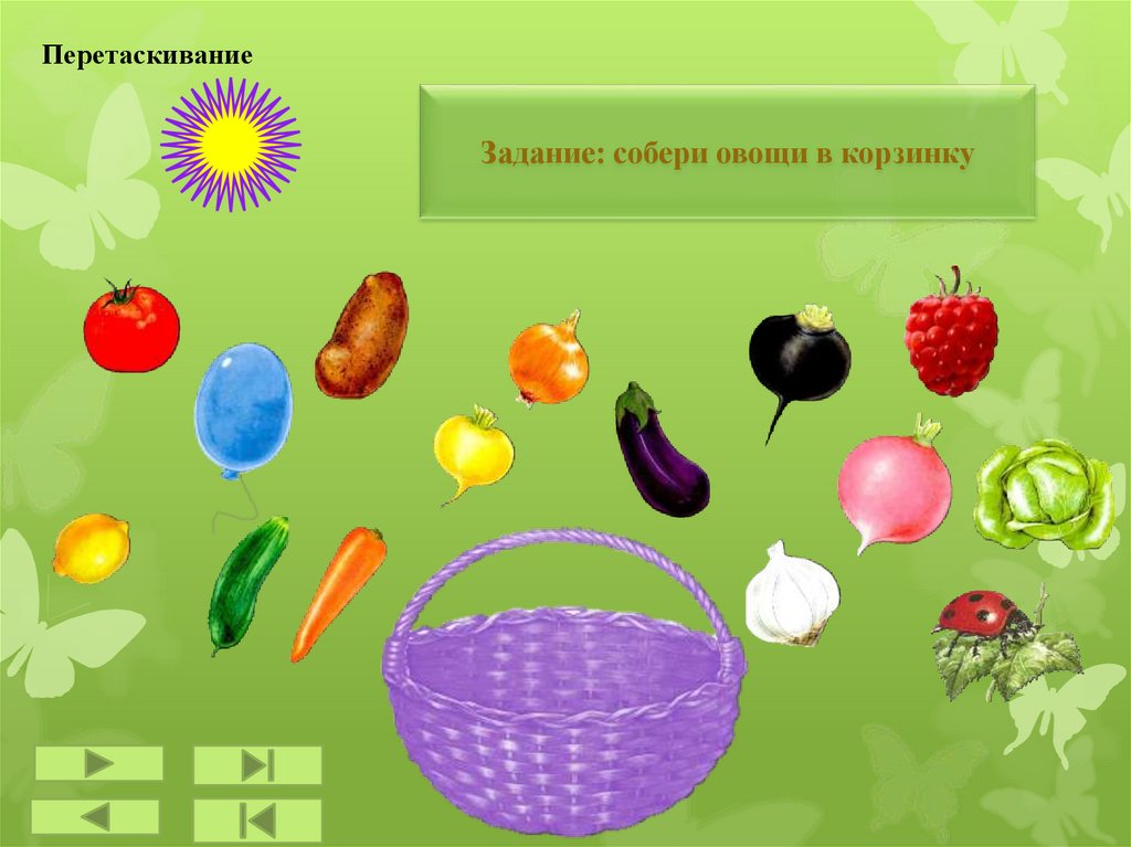 ПеретаскиваниеЗадание: собери овощи в корзинку
