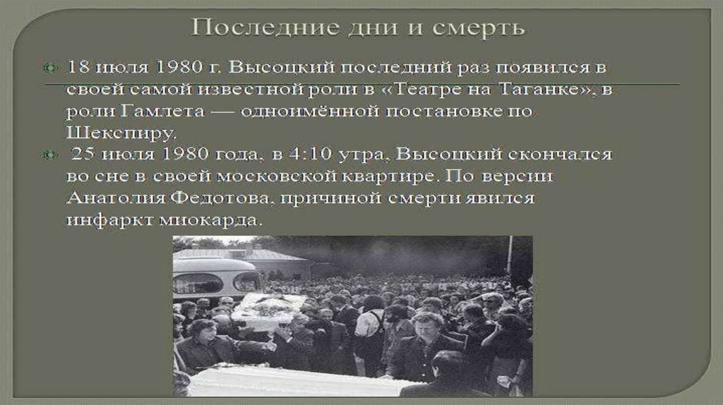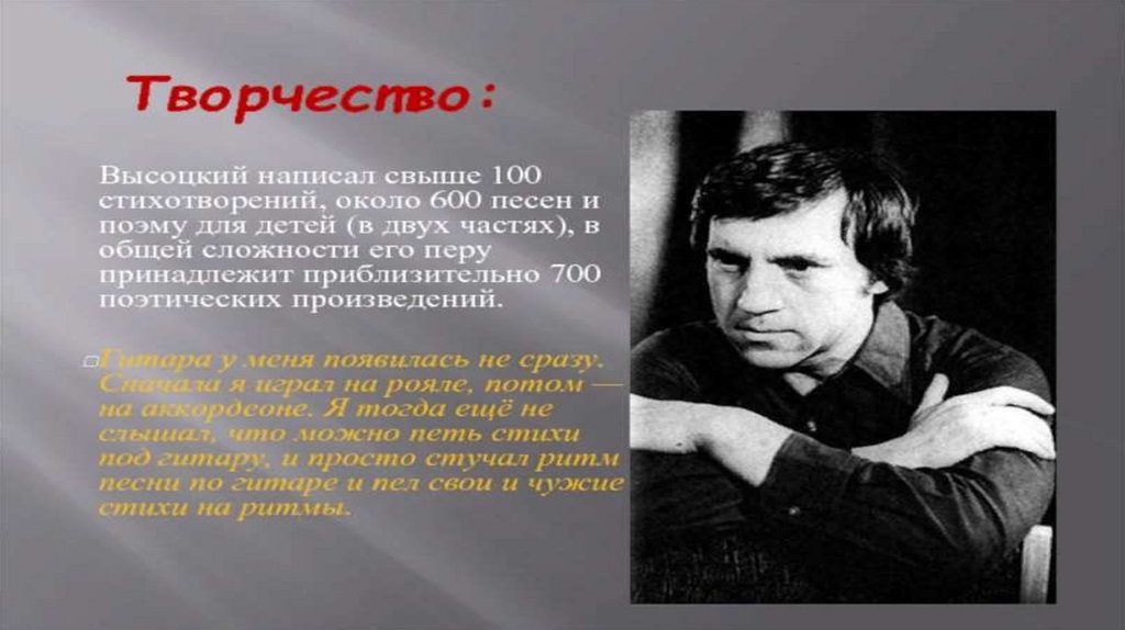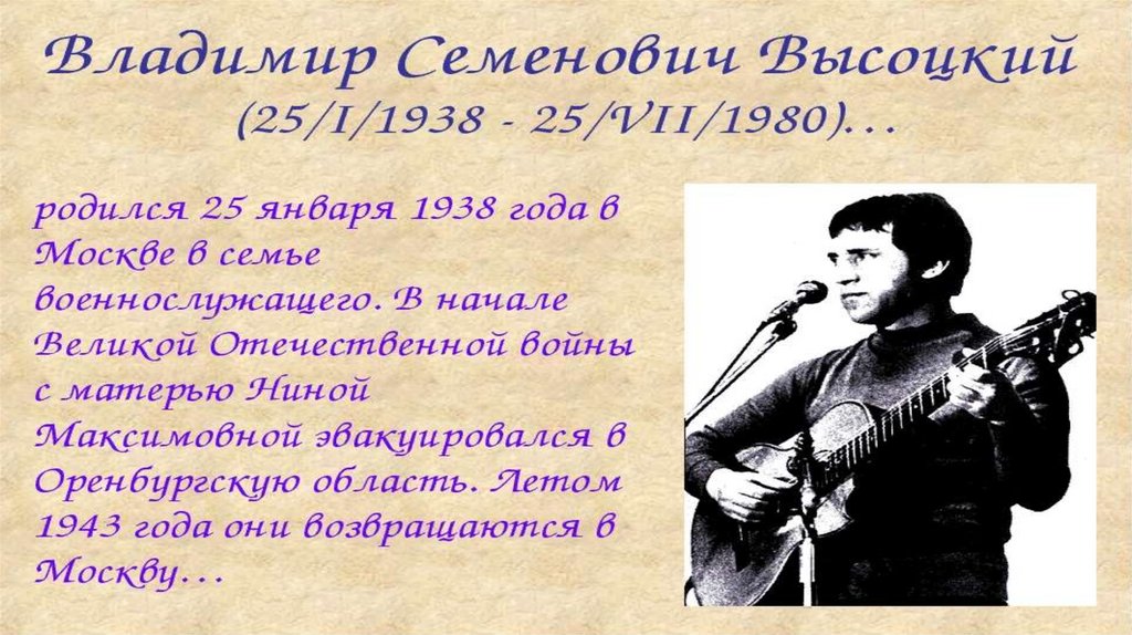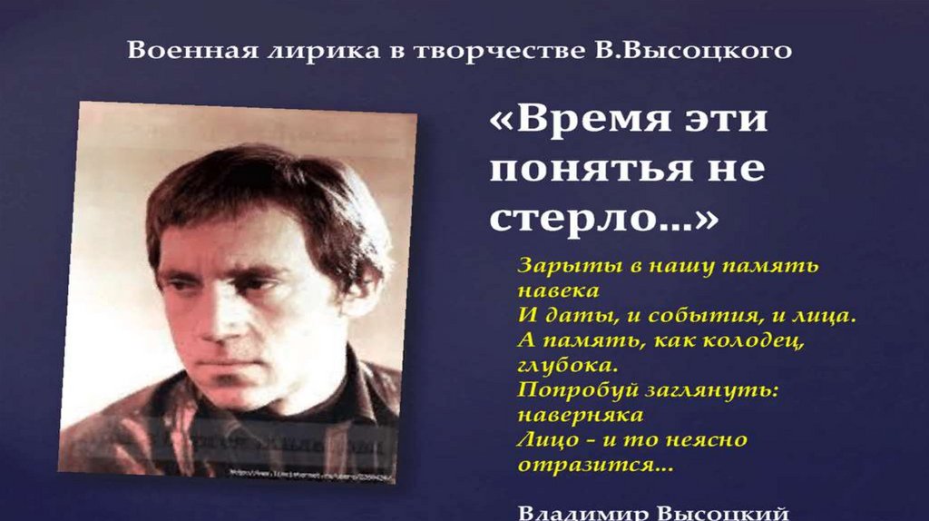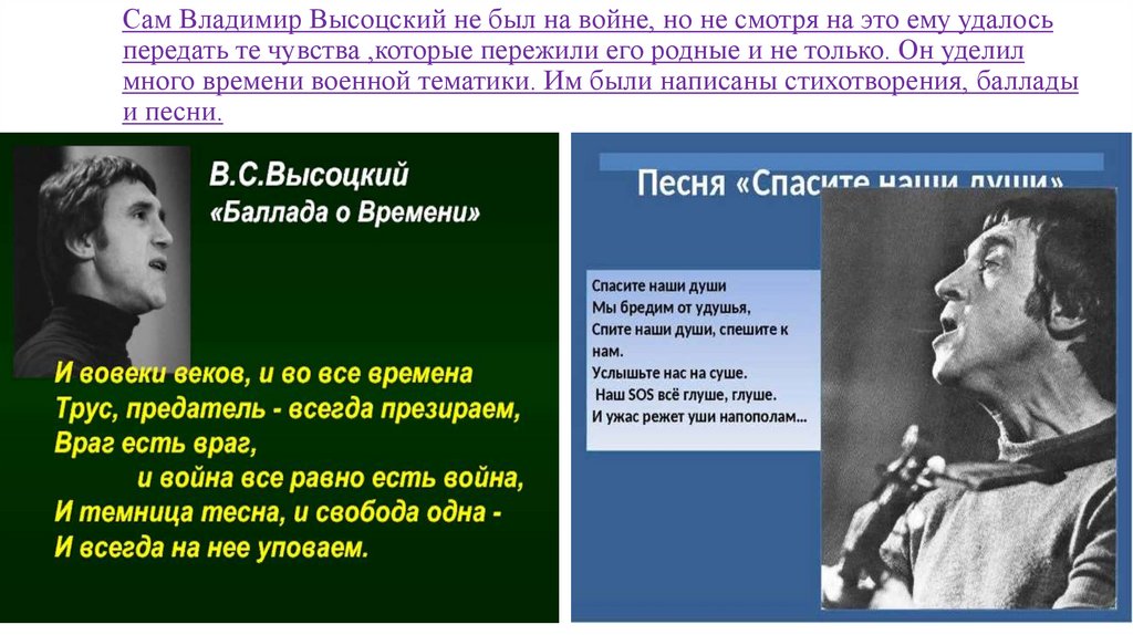 Сам Владимир Высоцский не был на войне, но не смотря на это ему удалосьпередать те чувства ,которые пережили его родные и не только. Он уделил
