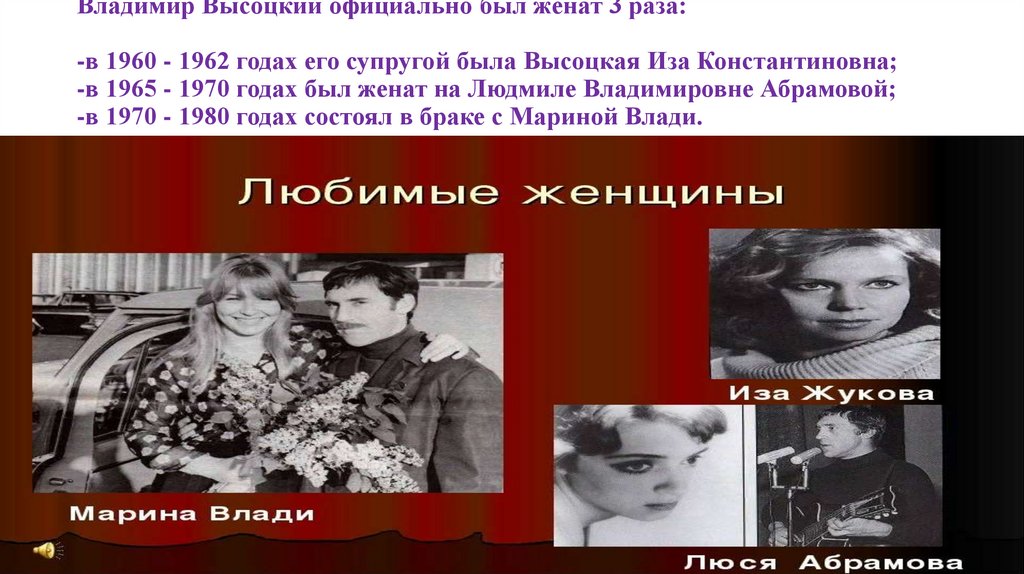 Владимир Высоцкий официально был женат 3 раза:-в 1960 - 1962 годах его супругой была Высоцкая Иза Константиновна;